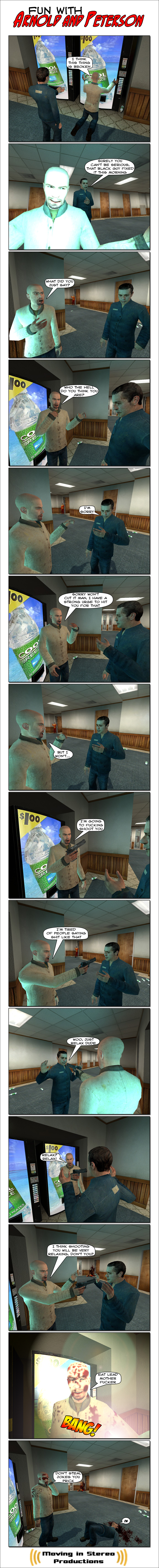 Notes: This comic was an attempt to start an ongoing series but it never really went anywhere. The main problem was that I never really introduced the characters or the universe in anyway. I envisioned them as kind of an extreme version of slapstick but at the same time be immortal so that they could kill each other over and over again. I was also trying to setup a deeper story ark with Redpill being eaten by skulls in the background, but again I never really explained this so it just seemed weird. I think these comics would have gone over slightly better if I did at least say who was Arnold and who was Peterson. Live and learn though