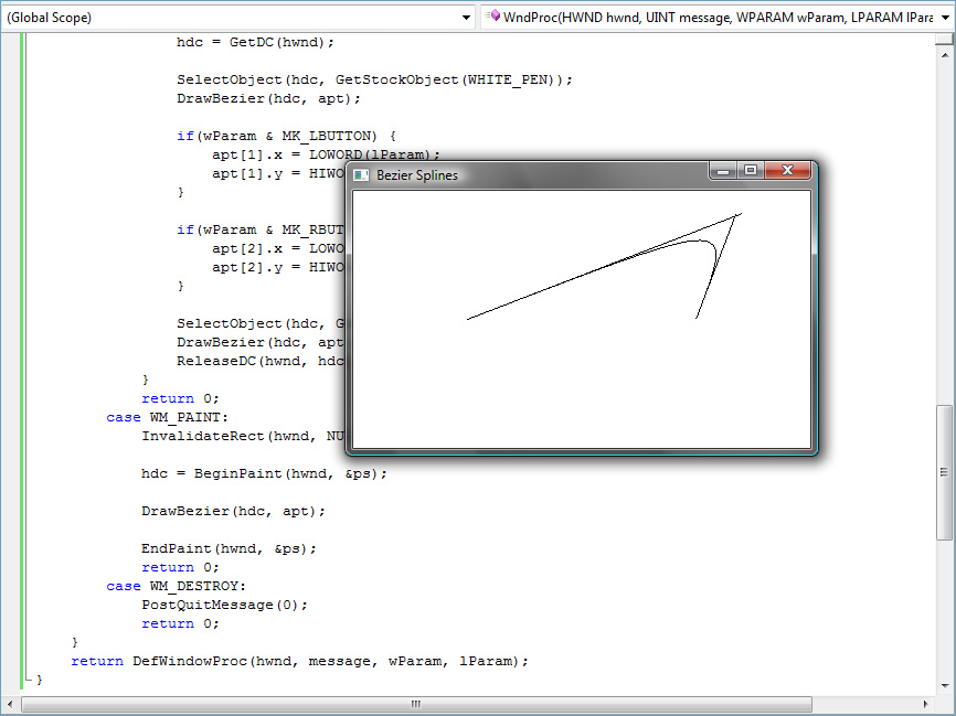 Notes: This program uses the PolyBezier() function to draw a Bezier Splines section. This program also has a preview of mouse functionality by making it so that mouse clicks control the shape of the spline. The window shows a curve drawn from a point a quarter in on the left and centered vertically to a point a quarter in on the right. Two straight lines go from those two points to a point above them with the curve going along one for a bit and then bending to go down the other