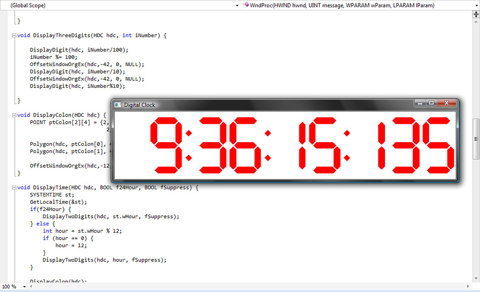 Description: A screenshot of a program in front of a window containing code. The program displays the clock in a digital format with red letters on a white background. The time is shown as hours:minutes:seconds:milliseconds